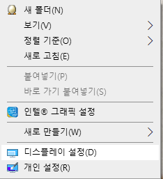 위 그림과 같이 바탕화면 빈공간에서 마우스 오른쪽 버튼을 클릭후 디스플레이 설정을 클릭합니다.