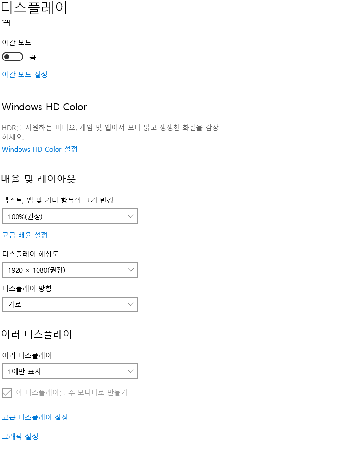 여러 디스플레이라고 써져 있는곳을 보면 1에만 표시 이렇게 되어 있습니다. 이렇게 설정이 되어 있으면 해당 번호의 장치에만 화면이 보이게 됩니다.